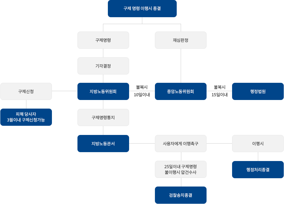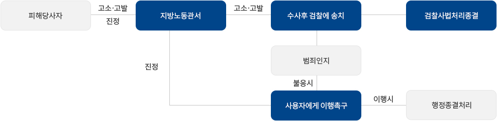 권리를 침해당한 근로자 또는 노동조합이 지방 노동관서에 진정, 고소 등 사용자에 대한 처벌을 요구할 수 있으며, 노동위원회의 구제신청과 병행하여 신청할 수 있습니다.(부당노동행위는 피해자의 의사에 관계없이 처벌할 수 있음)