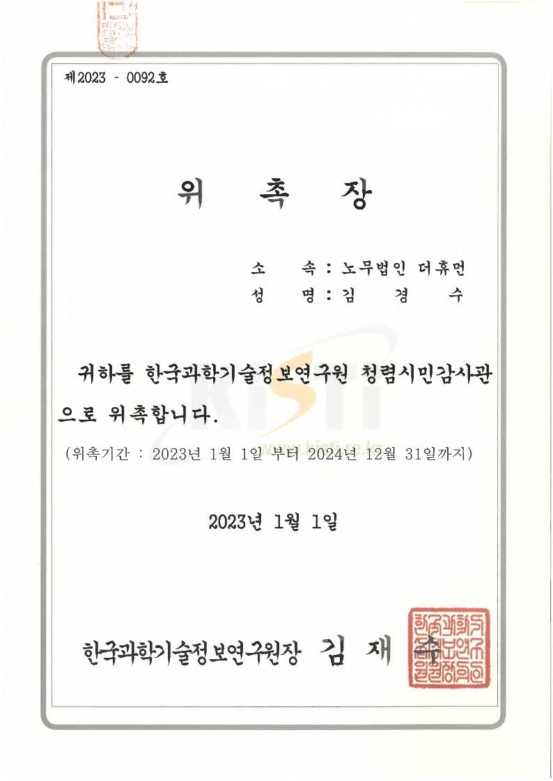 대전지사 김경수 노무사님께서 한국과학기술정보연구원 청렴시민감사관으로 위촉되셨습니다.