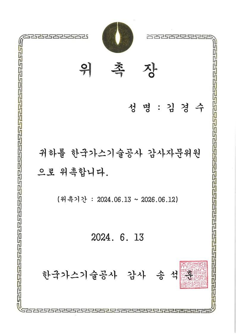 김경수 대표노무사가 한국가스기술공사 감사자문위원으로 위촉되셨습니다.