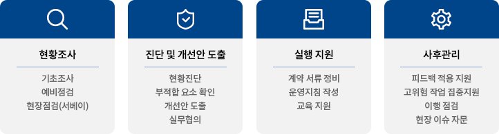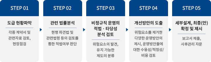 도급계약서 및 공정도 등을 포함한 제반 자료의 적정성을 검토하고 설문ㆍ인터뷰 등현황조사를 통해 실제 도급 운영실태를 점검하여 위장도급 또는 불법파견으로 판정될 수 있는 요소를 제거하고 합법적인 도급운영 방안을 설계합니다.