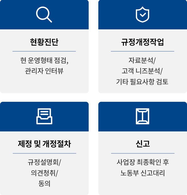 대부분 기업은 자체적 필요에 의해 다양한 내부규정을 만들어 운영하고 있습니다. 이 경우 법정필수 기재사항이 누락되거나 사업장 현실에 맞지 않는 타사 취업규칙을 그대로 활용하여 법적으로 문제되는 경우가 많습니다. 따라서 노사 분쟁 가능성을 사전에 방지하고 사업장 현실을 최대한 반영하고 적법한 절차로 규정을 정비할 필요가 있습니다.